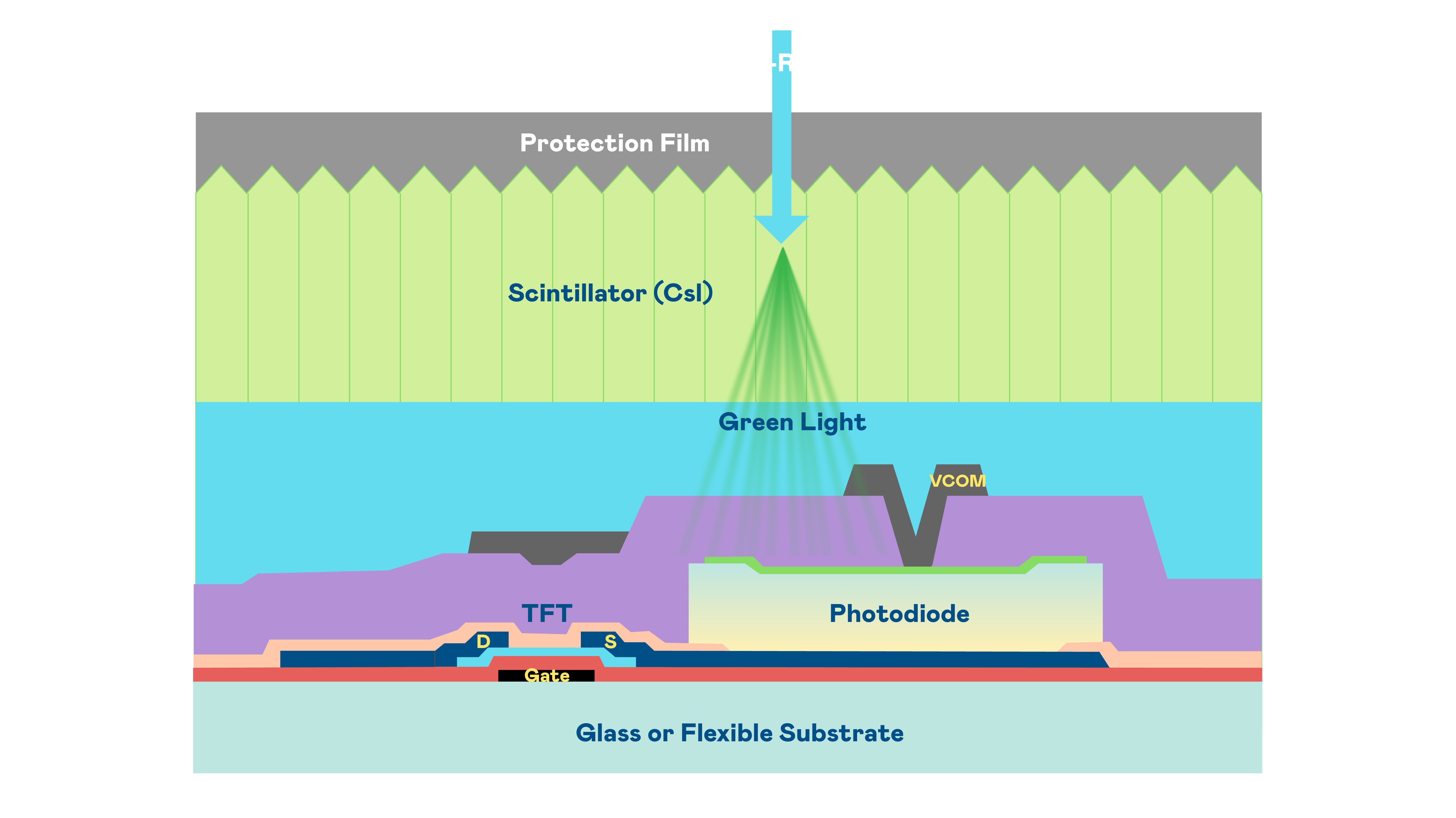 z6人生就是博的X光影像感测阵列使用薄膜电晶体 (TFT) 作为每个像素的读取开关,搭配光电二极体(Photodiode)的光电转换元件,用以感测X光影像讯号。